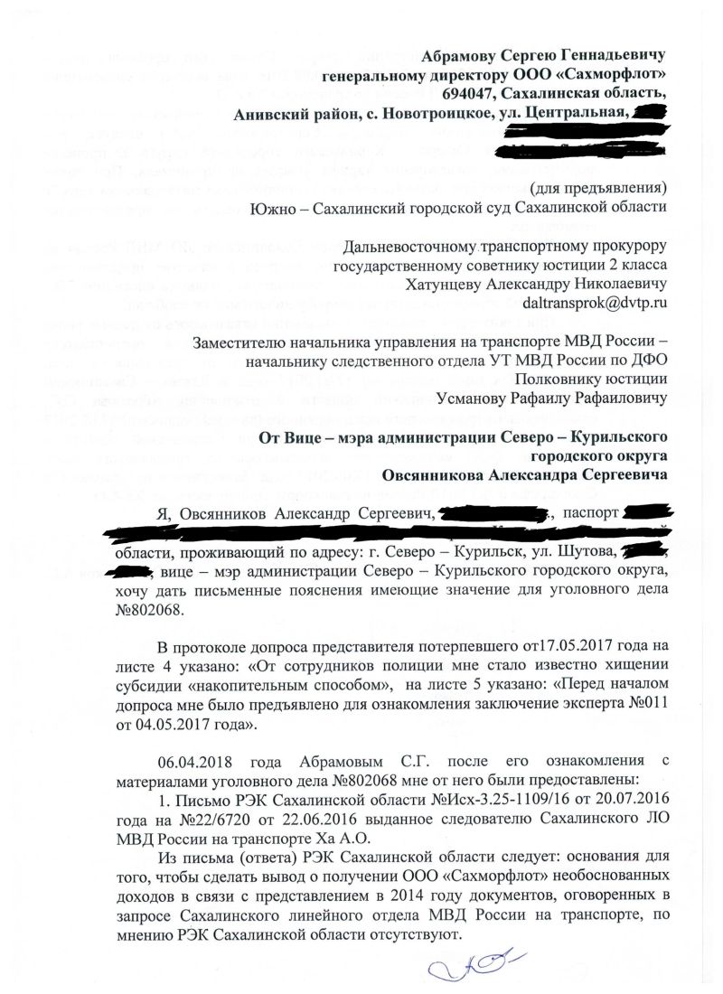 Затем 17 мая 2017 года следователь Ха А.О. выезжает в г. Северо-Курильск (остров Парамушир). Там у вице-мэра округа Овсянникова А.С. со следователем состоялся в ультимативной форме разговор, что если он (Овсянников), мол, не подпишет необходимые документы, то сам и другие должностные лица администрации могут оказаться под следствием. Со слов Овсянникова А.С., разговора не получился. Но Овсянников все же подписал документы, заранее заготовленные следователем (протокол допроса и гражданский иск). Об этих обстоятельствах Овсянников А.С. рассказал мне по телефону.