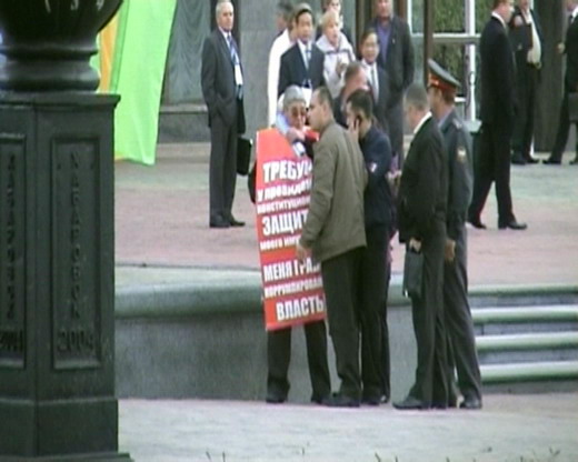 - На протяжении двух десятилетий у меня изъяли собственности на 17 млн руб., вложенных в развитие инфраструктуры края, - рассказал нам пикетчик. - Был у меня авторынок в Северном микрорайоне. В 2005 году его снесли бульдозером. Кроме того, было у меня пятиэтажное здание, башня на берегу Амура, которое в 1991 году мне передали для реконструкции вместе с землей в бессрочной пользование. Я туда вложил было $235 тыс. В 2007 году был судебный спор, а по нему здание было изъято как бесхозное. От безысходности и беззакония я и вышел на форум, чтобы хоть международная общественность обратила внимание на мою ситуацию.