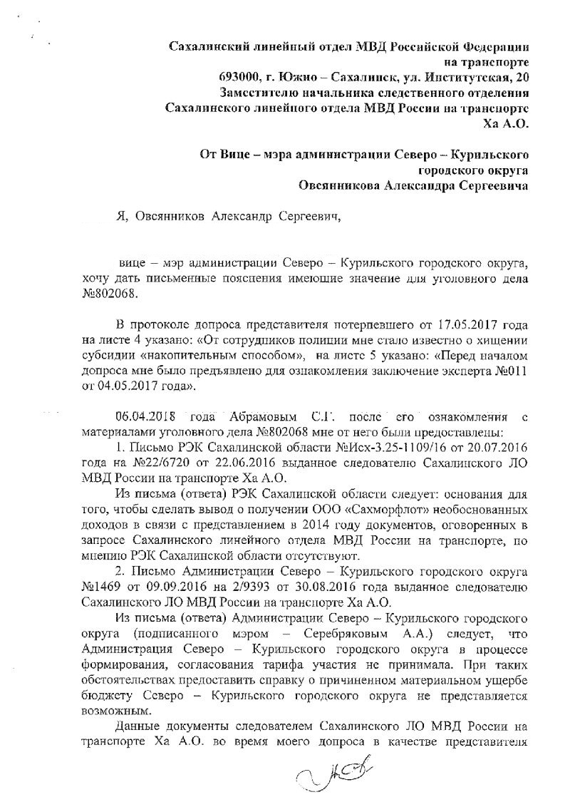 4. В апреле 2018 года после моего ознакомления с материалами УД №802068, я и мои защитники объяснили Овсянникову А.С. - вице мэру Северо-Курильского городского округа - абсурдность предъявляемых следователем Ха А.О. обвинений, с учетом позиции РЭК Сахалинской области по данному вопросу.