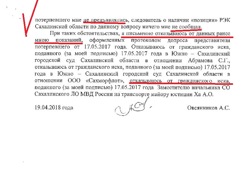 После чего Овсянников А.С. написал письменный отказ от ранее данных показаний и письменный отказ от гражданского иска, поданного от имени администрации Северо- Курильского городского округа (копию письменного отказа прилагаю).