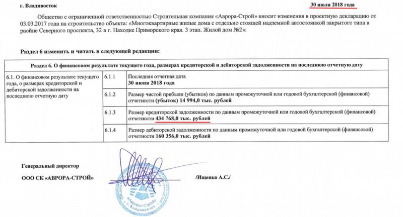 Но десять миллионов - капля в море долгов коммуниста. Общая сумма задолженности «Авроры-строй» приближается к 0,5 млрд рублей. Об этом стало известно из документа, подписанного самим Ищенко. Это корректировка проектной декларации на строительство того самого ЖК «Северный» в Находке. Подобную декларацию обязан подавать каждый застройщик. Там он должен указать помимо других параметров размер своей прибыли, убытков и долгов. В июле Ищенко написал, что сумма годовой прибыли за 2017-й составила 15 млн, а кредиторской задолженности - 434,7 млн рублей.