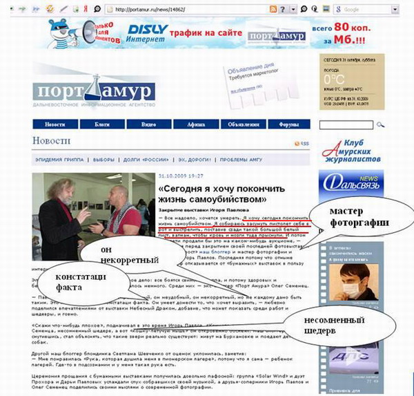 — Все надоело, хочется умереть. Я хочу сегодня покончить жизнь самоубийством. Я собираюсь засунуть пистолет себе в рот и выстрелить, поставив сзади такой большой белый лист, ватман, чтобы кровь и мозги туда прыснули. И потом мои дети продали бы это на каком-нибудь аукционе, — признался перед закрытием своей последней фотовыставки «Мир не прост» наш блоггер и мастер фоторгафии и эпатажа Игорь Павлов. Последняя потому что отныне фотограф отказывается от «бумажных» выставок в пользу интернета.