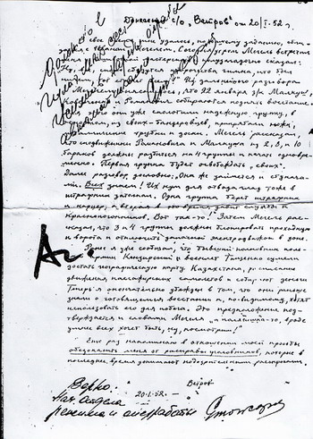 «Сов. секретно. Донесение с/о (секретный осведомитель) от 20/1 - 52 г.