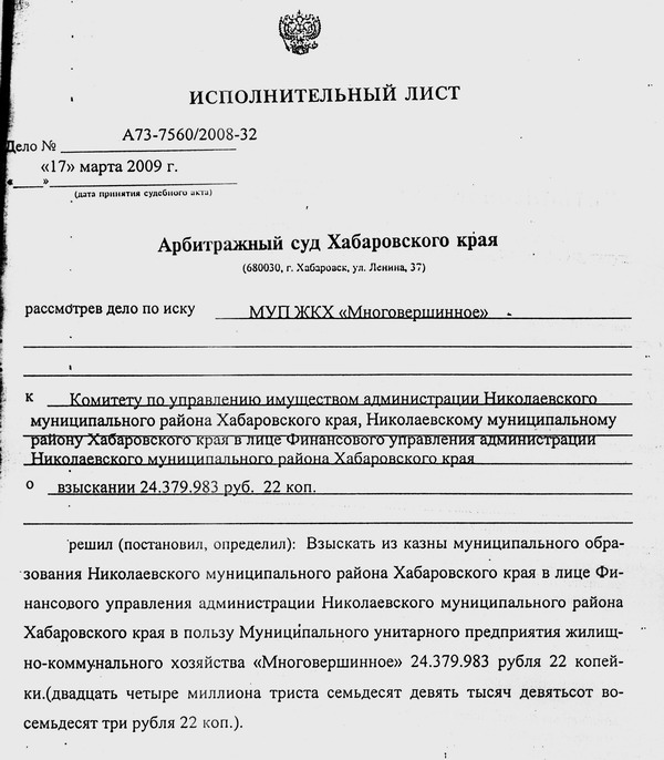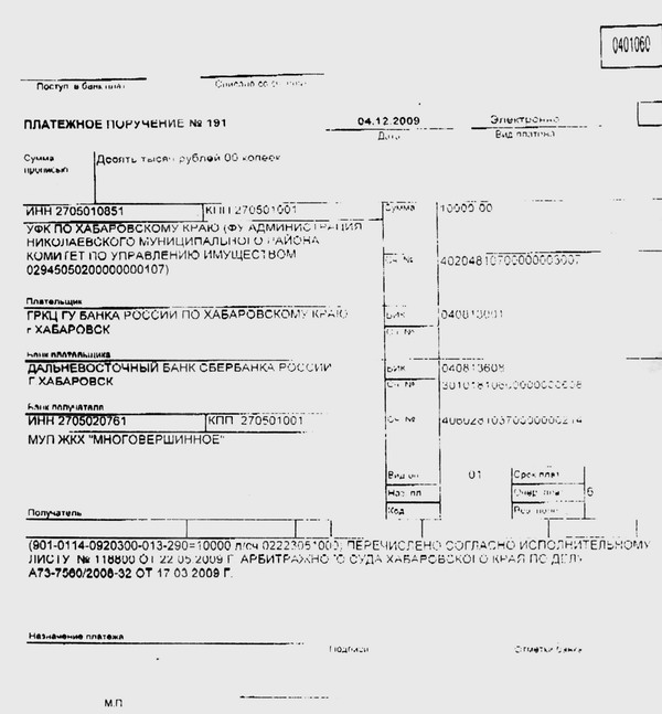 Как оказалось, новый глава района Сергей Лысаков 4 декабря подписал почти секретное платежное поручение №191, по которому администрация района перевела на счет банкрота МУП ЖКХ «Многовершинное» 10 тыс. руб. Сумма, правда, невелика. Но если знать, что таких сумм в МУП должно быть переведено 2,4 тысячи раз, то есть чего пугаться. Правда, в том же платежном поручении в самом низу указано основание: «перечислено согласно исполнительному листу №118800 от 25.05.09 арбитражного суда Хабаровского края».