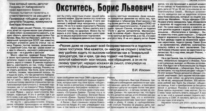 Но мы-то — дальневосточники. Становление «общака» происходило на наших глазах. И при всем желании Виктор Илюхин не мог бы стать «крестным отцом» нашей хабаровской мафии. Другие заняли это почетное место. Те, кто находился рядом. У кого связанные с мафией лица находились в охранниках. Но их-то и нужно журналисту Резнику оставить «ни при чем». Нужно свалить все с больной головы на здоровую. Можно бы поверить в этот бред, да выпирает шило правды из мешка журналистских подтасовок.
