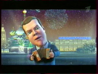 «Первый канал» в новогоднем эфире показал компьютерный мультфильм, персонажами которого стали показанные в карикатурном виде президент Медведев и премьер-министр Путин.