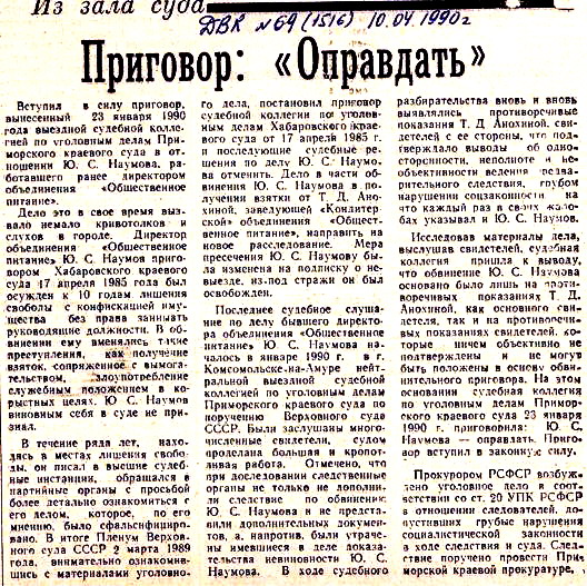Месяц назад судебная коллегия по уголовным делам Приморского краевого суда поставила последнюю точку в деле Наумова Юрия Семеновича, бывшего директора Комсомольского-на-Амуре объединения «Общественное питание». Позади у него четыре с лишним года пребывания в колонии строгого режима, приговор Хабаровского краевого суда по обвинению во взяточничестве, невероятно долгая борьба с органами правосудия за пересмотр предъявленного обвинения.