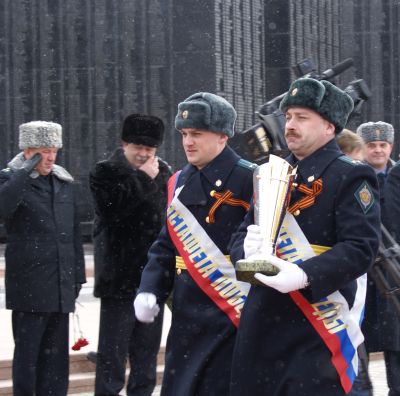 Торжественная церемония встречи и передачи эстафеты состоялась на хабаровской площади Славы. Несмотря на сильный холодный ветер и снег, здесь собралось большое количество школьников, пограничников, представителей власти и общественности.