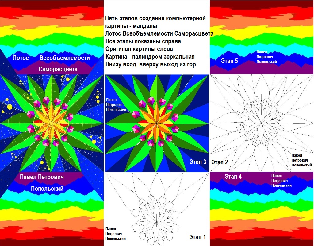Справа - пять этапов создания мандалы. Графические прорисовки лепестков Лотоса и пентаграмм кристаллов вокруг него - 1 и 2, окраска Лотоса - 3. Картины входа и выхода из гор, из Горнего Мира, соответствующие закату и рассвету или наоборот по настроению - 4 и 5.