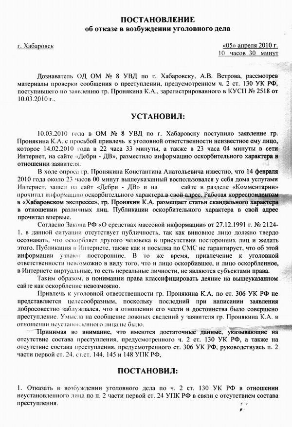 10.03.2010 года в ОМ № 8 УВД по г. Хабаровску поступило заявление гр. Пронякина К.А. с просьбой привлечь к уголовной ответственности неизвестное ему лицо, которое 14.02.2010 года в 22 часа 33 минуты, а также в 23 часа 04 минуты в сети Интернет, на сайте «Дебри – ДВ», разместило информацию оскорбительного характера в отношении заявителя.