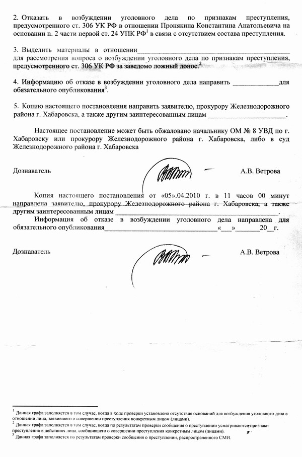 2. Отказать в возбуждении уголовного дела по признакам преступления, предусмотренного ст. 306 УК РФ в отношении Пронякина Константина Анатольевича на основании п. 2 части первой ст. 24 УПК РФ[1] в связи с отсутствием состава преступления.