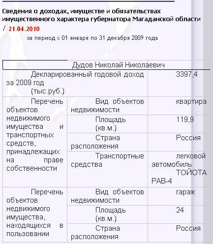 Как уже ранее сообщали со ссылкой на документы регионального бюджета, доход Николая Дудова в 2009 году составил 3 млн. 397 тыс. рублей.
