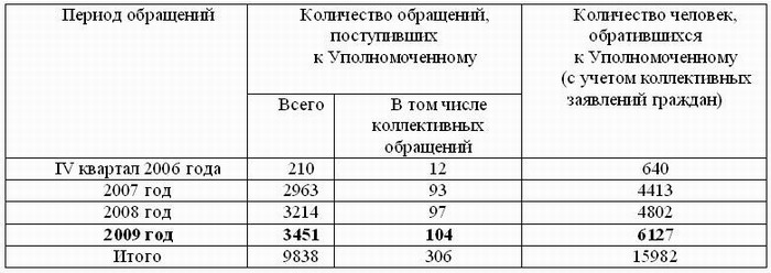 Со дня назначения Уполномоченного 27 сентября 2006 года, им было рассмотрено почти десять тысяч обращений граждан. Общие данные о количестве обращений и заявителях приводятся в таблице № 1: