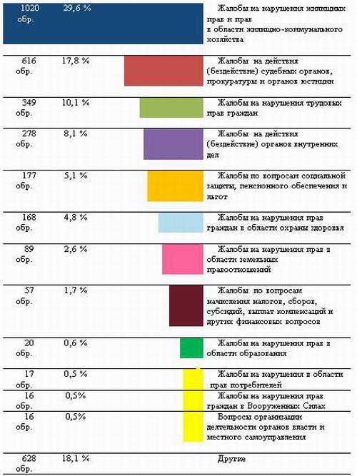 В обращениях граждан отражается практически весь спектр проблем современной жизни общества, существующие нарушения прав и законных интересов людей. Вместе с тем, тематический анализ обращений граждан показывает, что проблемы в области нарушений социально-экономических и личных прав граждан доминируют в почте Уполномоченного. Как и в 2008 году, лидирующее положение занимают обращения по нарушениям жилищных прав граждан, а также прав в области жилищно-коммунального хозяйства - 1020 обращений (в 2008 году - 1252 обращения). На вторую позицию вышли заявления и жалобы граждан на действия (бездействие) судебных органов, прокуратуры и органов юстиции – 616 обращений. Несмотря на влияние мирового финансового кризиса на экономику страны, незначительно выросло количество жалоб по нарушениям трудовых прав граждан (в 2008 году -326 обращений, в 2009 году – 349), что свидетельствует об эффективности мер, предпринимаемых федеральными и краевыми органами власти, при обеспечении трудовых прав трудящихся.