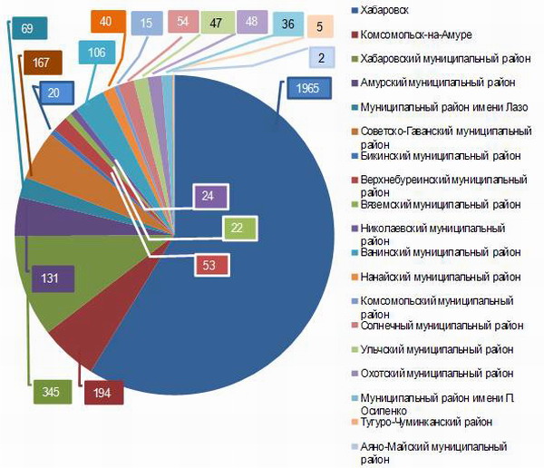 Обращения граждан поступили со всей территории Хабаровского края. Как и прежде, основное их количество поступило от жителей г. Хабаровска – 1965 заявлений, что составляет 56,9 процента от общего количества обращений, поступивших в адрес Уполномоченного (в 2008 году – 1738 заявлений). Вторую позицию занимает Хабаровский муниципальный район – 345 обращений, что составляет 9,9 процента от общего числа обращений. Третья позиция принадлежит г. Комсомольску-на-Амуре – 194 жалобы граждан (5,6 процента). На диаграмме № 3 приводится полная информация о количестве обращений, поступивших из городских округов и муниципальных районов края: