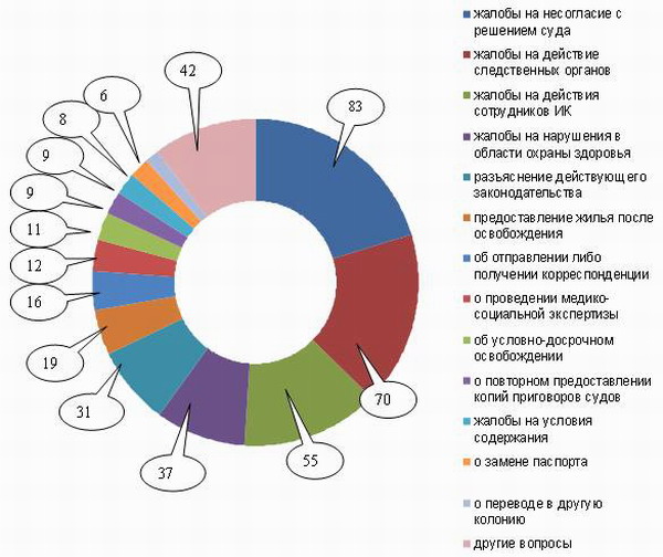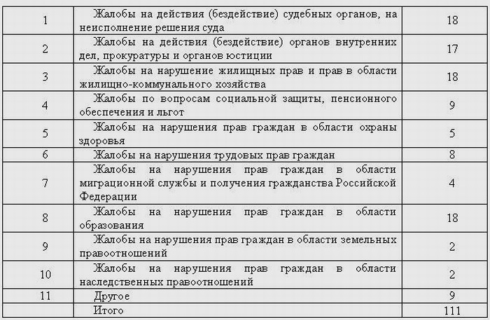 По всем обращениям даны письменные юридические консультации. Они касаются проблем по жилью или его ремонту, восстановлению северного стажа, медицинскому обслуживанию, по банкротству предприятий и невыплате зарплаты бывшим работникам, нарушениям трудового законодательства, по выплатам пенсий и алиментов. Часть вопросов – о правах военнослужащих и осужденных, об оплате приемным семьям и восстановлению утерянных семьями документов.