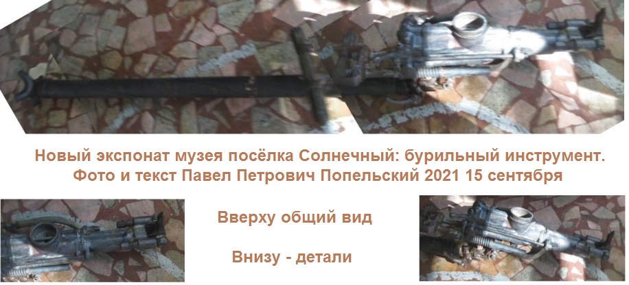 Когда я был в музее поселка Солнечный 15 сентября 2021 и делал съемку для документальной повести в газете "Амурская Заря" и фотопубликаций на Дебри ДВ, то увидел длинный очень старый инструмент, похожий на садовый разбрызгиватель, укрепленный с рукоятью для его удерживания на длинной штанге. Когда я удивленно спросил у женщин-сотрудников музея, что это, они объяснили мне, что это - новейшее поступление в фонды музея от горняков расположенных близ Солнечного рудничных штолен. Это оказался бурильный инструмент. Он настолько новый, что пока еще не находится под стеклом в залах экспозиции музея. Его нужно описать и только после представить посетителям. Но если вы хотите знать, чем новым пополнился музей поселка Солнечный, то это - непосредственная история шахтерского дела поселка. Инструмент горняков.