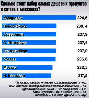 В июньском мониторинге в эту опасную зону попал Хабаровск. А отправной точкой для исследования стал Нижний Новгород. Эта волжская столица обеспечила малоимущим самый дешевый набор продуктов, немного потеснив майского лидера — Москву. В остальных городах отклонения от базовой цифры незначительны (см. таблицу). Корреспондент «МК» выяснил у экспертов ОП причины дороговизны в Хабаровске и потери лидерства Москвы в дешевизне. Разнобой цен на социально значимые товары, считают в ОП, неизбежен. Сказывается сразу несколько факторов: длина транспортных плечей, климатические условия, степень развития и диверсификация агропроизводства в окрестностях разных городов. Но их влияние, по расчетам экспертов ОП, не могут выходить за рамки 20%. В Хабаровске, где цены перехлестнули нижегородские почти на 50%, была достигнута почти 50%-ная ценовая планка, возможно действие нескольких субъективных факторов. «Плохая логистика или даже коррупция», — предполагают в Общественной палате. Так что хабаровским властям пора начать работу над ошибками.
