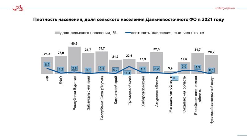 «В макрорегионе наименьшая доля сельских жителей в Магаданской области, в 6,5 раз меньше среднероссийского значения, а наибольшая - в Республике Бурятия, в 1,6 раза больше», - заключили аналитики.