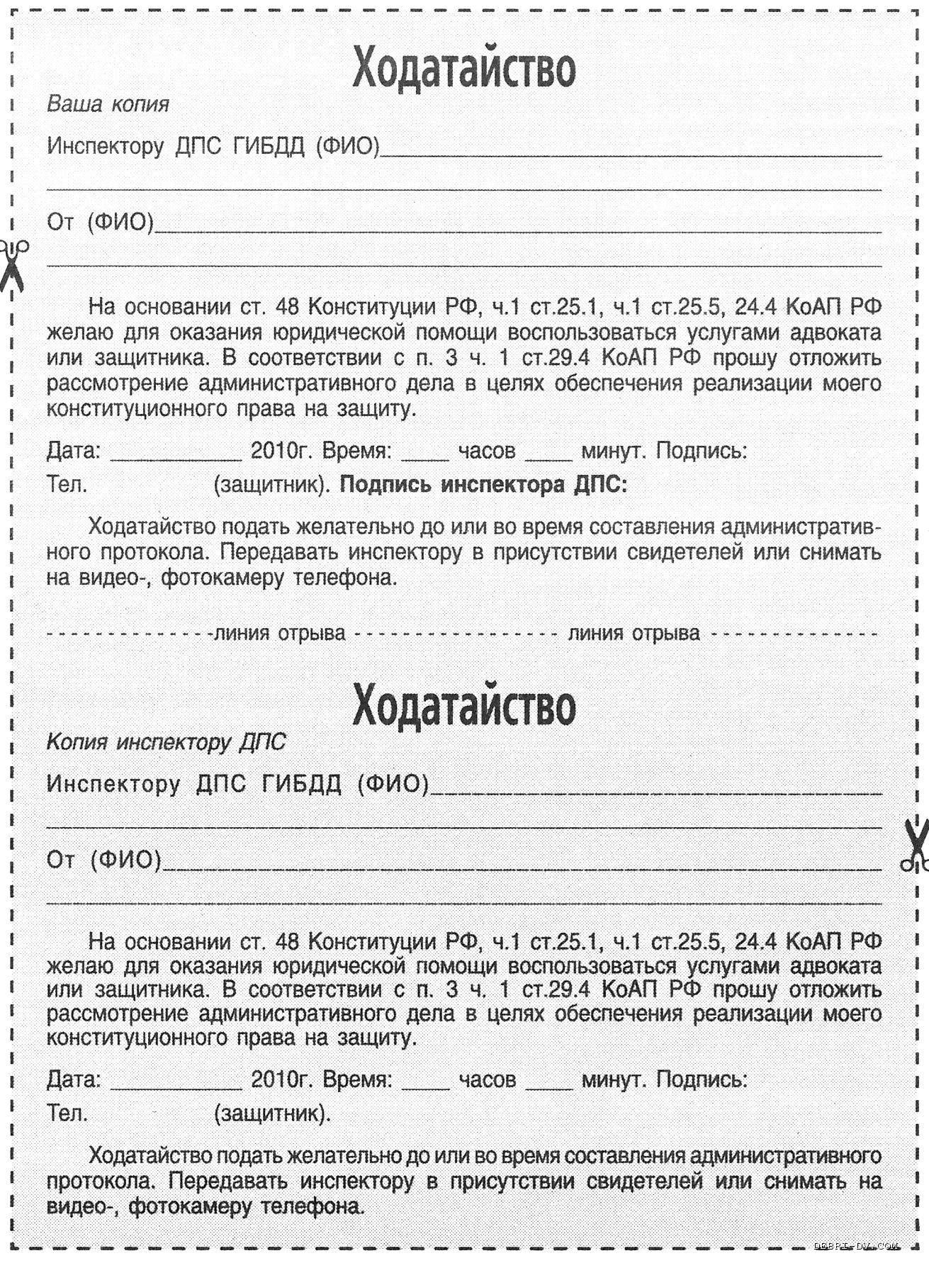 - Это ходатайство об оказании юридической помощи адвокатом или защитником, - поясняет Сергей Табатчиков. - Не обязательно пользоваться данной помощью. Надо лишь заполнить ходатайство при инспекторе, спросив у инспектора фамилию, имя и отчество. Он обязан представиться и представить удостоверение по вашему требованию. Обязательно проставьте в документе дату и еще обязательнее время. В дальнейшем это может сыграть решающую роль при разборе вашего правонарушения или вынесения постановления.