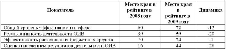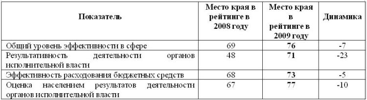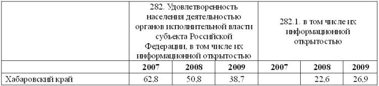 Ещё одним важным направлением административной реформы является повышение эффективности взаимодействия органов исполнительной власти и общества. Результативность этой работы отслеживается через показатели удовлетворённости населения работой властью. И это как же надо было организовывать взаимодействие краевой власти с народом, чтобы в отсутствии каких бы то ни было глобальных потрясений в крае в 2008 и в 2009 году получить такие данные по показателям удовлетворённости?