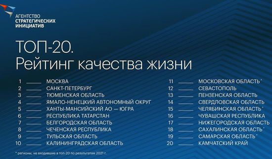 В первую десятку рейтинга качества жизни помимо Москвы, которая второй год подряд занимает лидирующую позицию, вошли: Санкт-Петербург, Тюменская область, Ямало-Ненецкий АО, Ханты-Мансийский автономный округ-Югра, Республика Татарстан, Белгородская область, Чеченская Республика, Тульская и Калининградская области. Результаты рейтинга главе государства Владимиру Путину представила генеральный директор Агентства стратегических инициатив Светлана Чупшева на заседании наблюдательного совета АСИ.