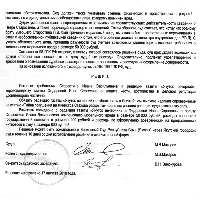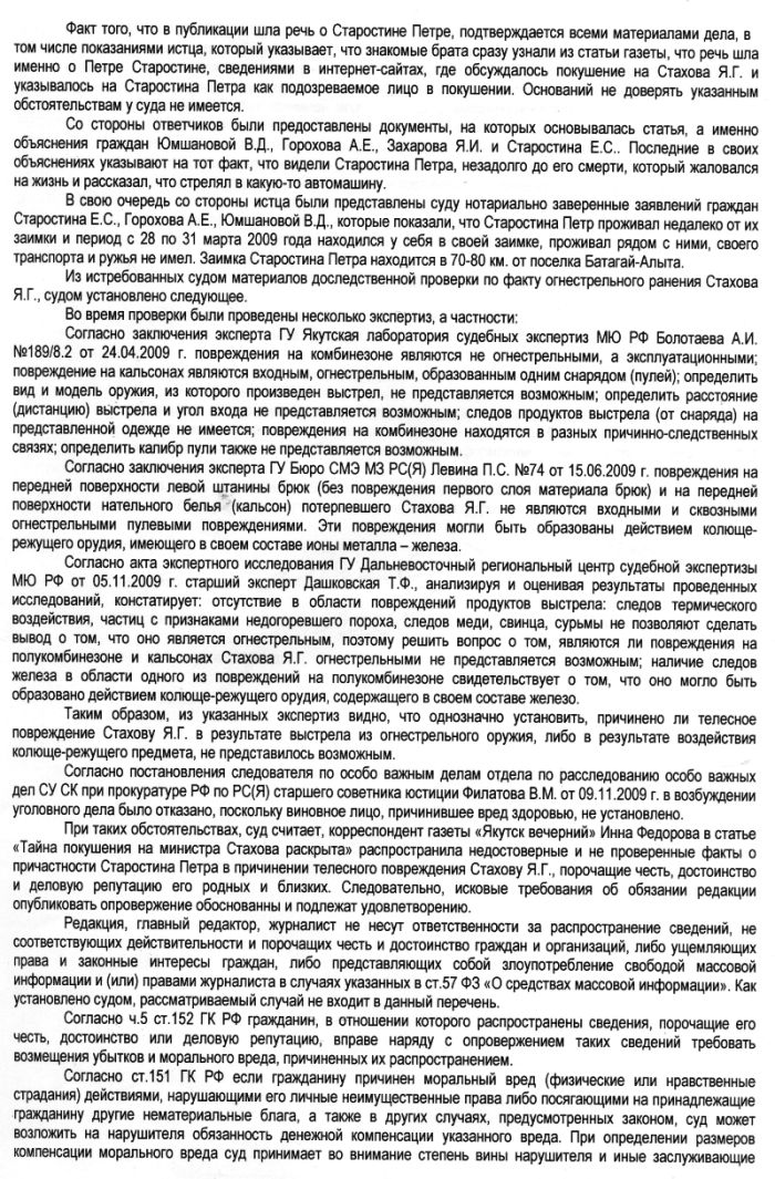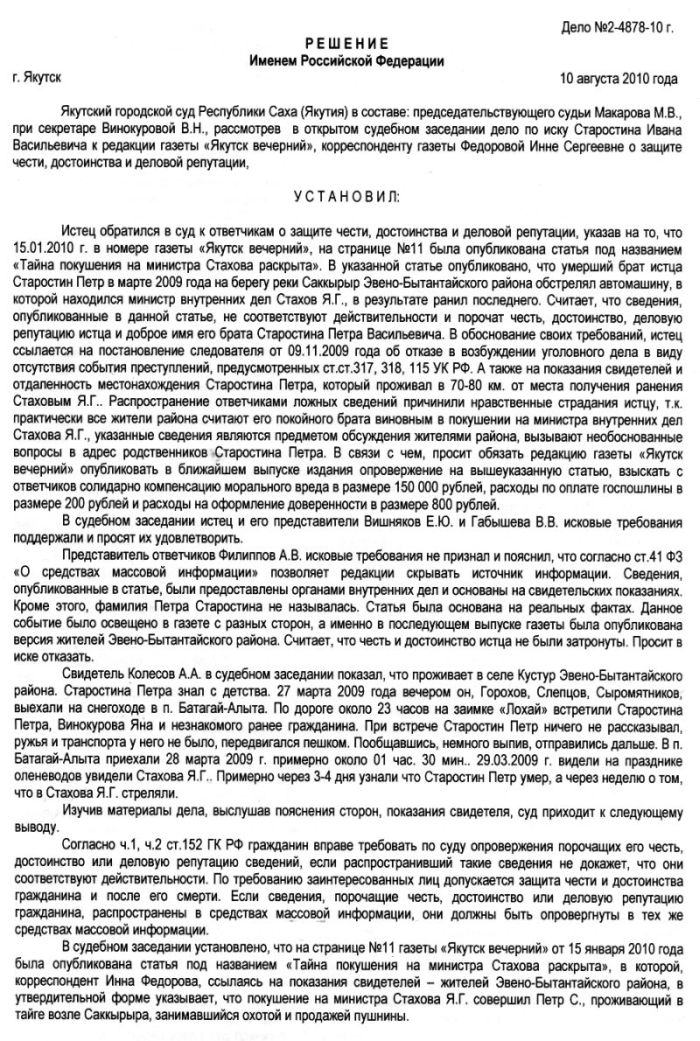 Елена Рыковцева: Тем не менее, нашли человека, который якобы стрелял. Итак, проходят 9 месяцев после публикации Виктории о том, что это была никакая не пуля, что штаны целые, и это заключение официального эксперта МВД. Проходит 9 месяцев, и вдруг одна из газет («Якутск вечерний», насколько я знаю) публикует статью, что найден виновник, что накануне самоубийства он сообщил двум жителям района о том, что это он стрелял в министра. После чего журналисты из другой газеты попытались поговорить с этими жителями, и те отказались от своих слов. Тем не менее, эта версия пошла гулять в массы, хотя официально под ней МВД не подписывалось, это все-таки версия газеты. И вот родственники этого несчастного самоубийцы подали в суд уже на «Якутск вечерний», который распространил эту версию. Что происходит дальше?