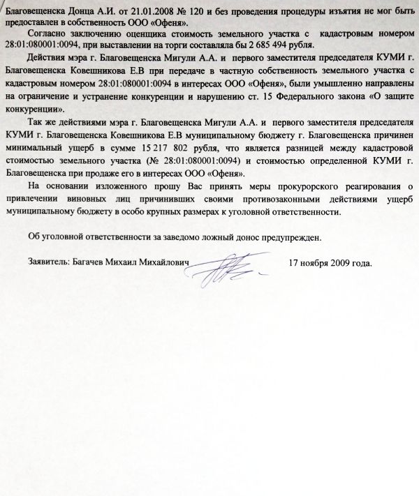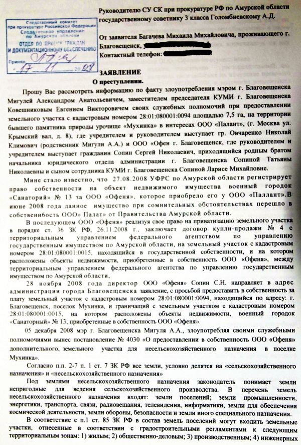 Багачев вскрыл кучу злоупотреблений и преступлений Мигули и его ближайшего окружения. Первые свои заявления о совершении им и его командой преступлений, Мих Мих написал в 2006 году, а с 2008-го не проходило недели, чтобы он не появлялся в следственных отделе и управлении. Бумаг на Мигулю у него – что у Остапа Бендера на гражданина Корейко, и он с удовольствием делился ими и со следственным отделом по Благовещенску, и с УВД и с прокуратурой.