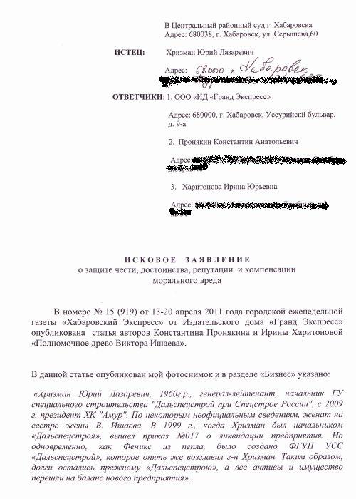 Сведения, распространенные в статье авторов Константина Пронякина и Ирины Харитоновой «Полномочное древо Виктора Ишаева» не соответствуют действительности, порочат мои честь и достоинство, подрывают мою деловую репутацию. Эти сведения содержат утверждения о нарушении мной действующего законодательства, совершении неблаговидных поступков, неправильном, неэтичном поведении, недобросовестности при осуществлении производственно-хозяйственной и предпринимательской деятельности.