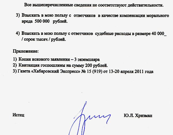 2) Обязать ответчиков в течение десяти дней со дня вступления решения суда в законную силу опубликовать в городской еженедельной газете «Хабаровский Экспресс» от Издательского дома «Гранд Экспресс» опровержение не соответствующих действительности, порочащих мои честь, достоинство, доброе имя и деловую репутацию, а так же содержащих обвинение в нарушении мной действующего законодательства сведений, изложенных в статье авторов Константина Пронякина и Ирины Харитоновой «Полномочное древо Виктора Ишаева», распространенных в печатном издании еженедельной газеты «Хабаровский Экспресс» № 15 (919) от 13-20 апреля 2011 года следующего содержания: