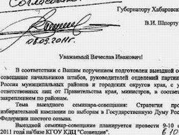 Губернатор Хабаровского края Вячеслав Шпорт 8 сентября согласовал подготовленный его заместителем Аркадием Мкртычевым график и список представителей краевого правительства для участия в семинаре-совещании «Единой России» по предстоящим выборам в Государственную думу. Об этом 9 сентября сообщил корреспондент Каспарова.Ru, направив в редакцию копию докладной Мкртычева.