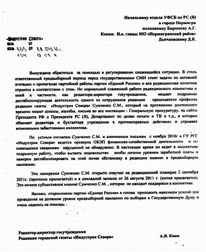 Редактор-директор госучреждения «Редакции городской газеты «Индустрия Севера» (г. Нерюнгри) Альбина Киян пожаловалась в ФСБ и в администрацию района на то, что ей мешают прославлять «Единую Россию». Непатриотичным, с ее точки зрения, оказался председатель профкома редакции, журналист Сергей Сумченко. Сторонник «Единой России» А.В.Киян сетует на то, что его заявления в генеральную прокуратур РФ на и на сайт Президента России послужили поводом для проведения ОБЭПовской проверки в редакции. При этом, по сведению редактора, ничего противозаконного проверка полицейских не выявила. Но заметим, что оперативники свою работу в «Индустрии севера» не прекратили. Так что, делать какие-либо выводы явно преждевременно. А история конфликта в государственной Нерюнгринской газете такова.