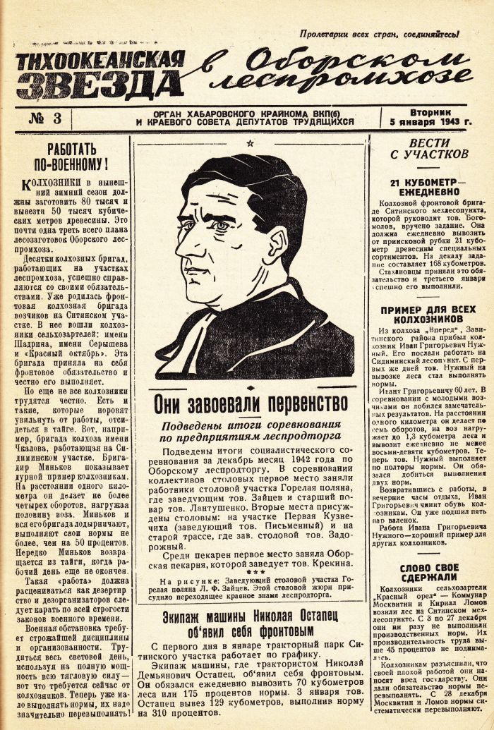 | «Тихоокеанская звезда» в Оборском леспромхозе, №3, 05.01.1943 г./ Нажмите, чтобы УВЕЛИЧИТЬ стр.1 |