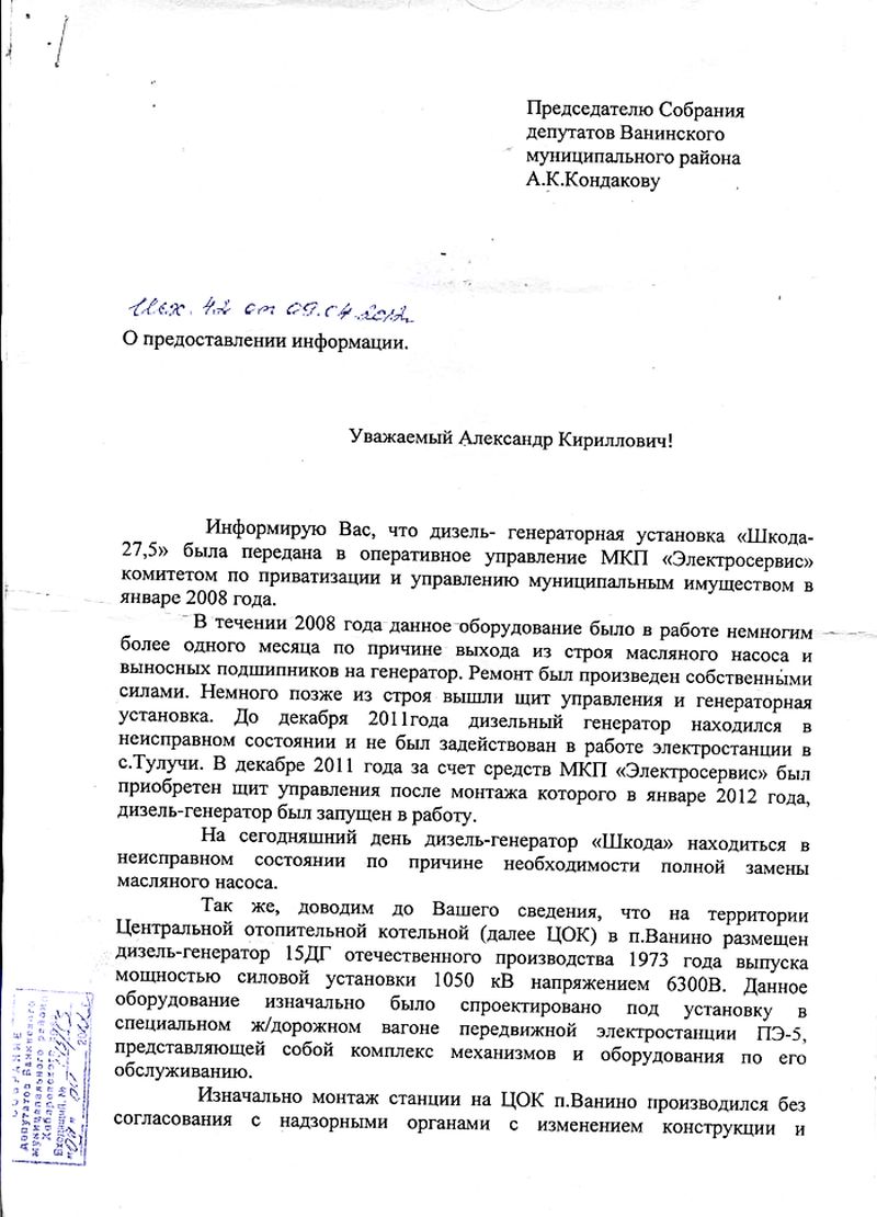 15 октября 2007 года был подписан акт приема-сдачи дизель-генератора для котельной п.Тулучи (правда, как обнаружится в дальнейшем, в платежном поручении указано, что деньги перечисляются за дизель-генератор для п. Тумнин?). Что же касается дизель-генератора для центральной котельной Ванино, то 25 декабря 2007 года директор ООО «Интеркомплекс» Е.Г.Шамонов пишет письмо в адрес администрации Ванинского района, в котором гарантирует поставку, все монтажные и пусконаладочные работы выполнить в срок до 26 февраля 2008 года. Но!