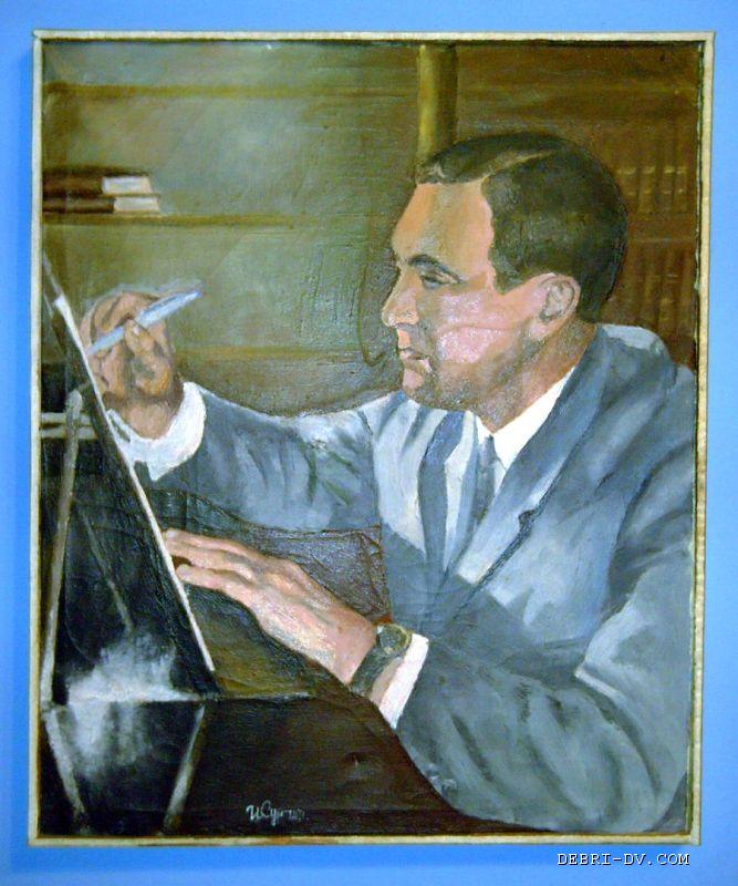 ...Тамара Петровна открыла нам дверь не сразу, замысловатые замки не поддавались. У входа нас встретил рыжий лохматый лев. Чау-чау по кличке Антей. Держать в доме собак - оказывается традиция еще со времен Юрия Яковлевича. Мы проходим в просторную комнату, где был когда-то кабинет композитора. Голубые обои, в тон - большой мягкий угловой диван, широкие черные полки до потолка, небольшой столик, компьютер, на стене - портрет маслом - Юрий Владимиров за работой: ноты и «Petrof».