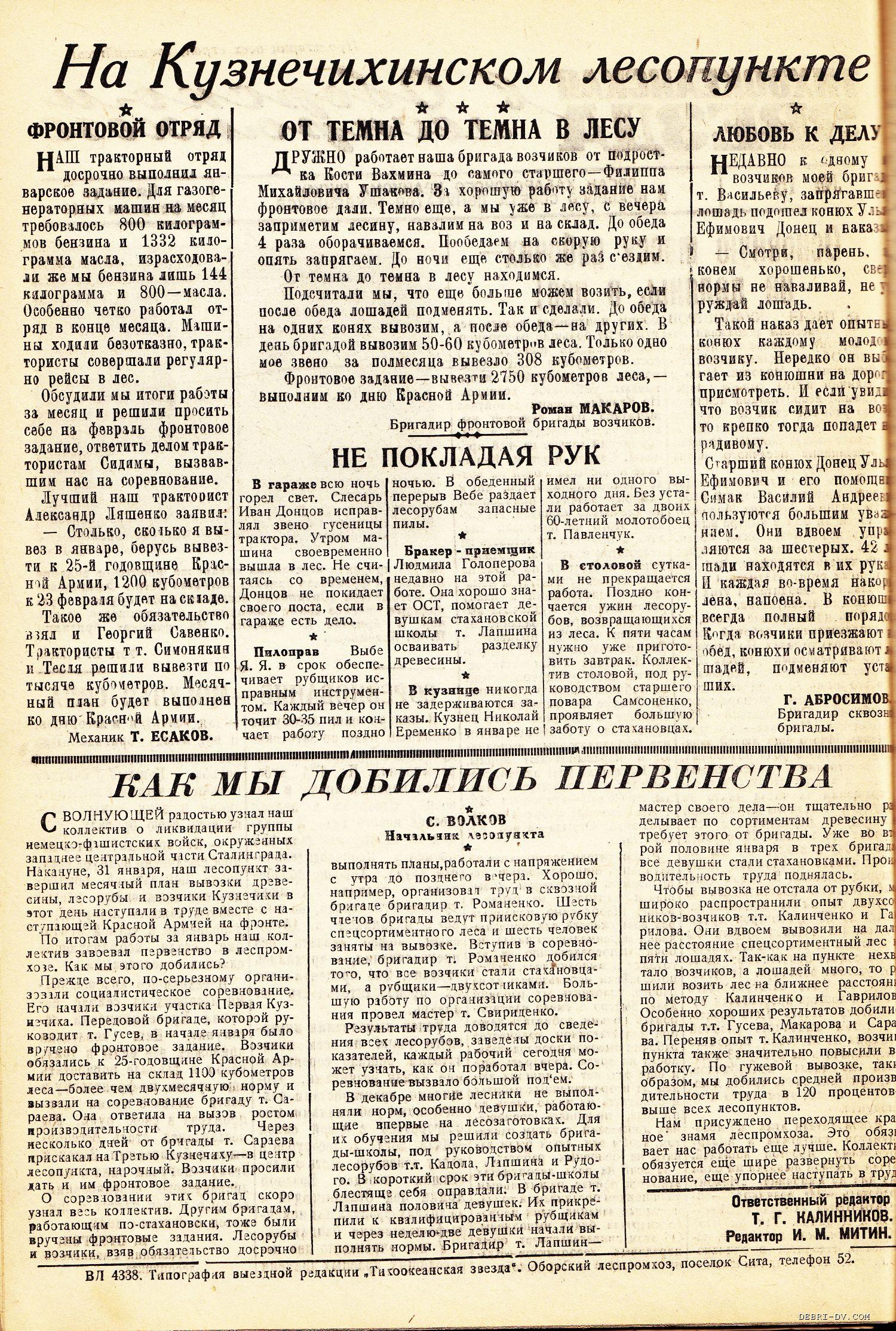 | «Тихоокеанская звезда» в Оборском леспромхозе, №15, 05.02.1943 г./ Нажмите, чтобы УВЕЛИЧИТЬ стр.1 |