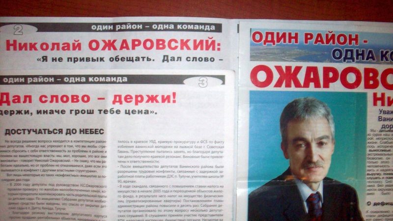 На выборах 2008 года Николай Ожаровский официально пообещал избирателям «расселение жителей Ванинского района из ветхого и аварийного жилья в 2008 году».