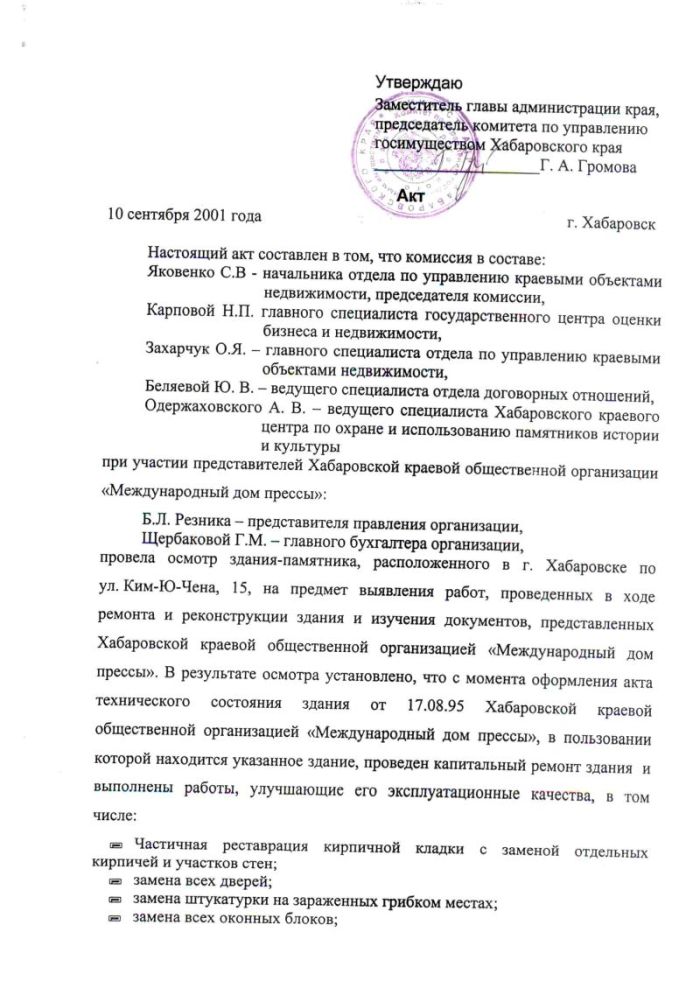 1. Все работы (ремонт и реконструкция в здании по ул. Ким Ю Чена, 15. - Ред.), описанные в акте Комиссии от 10 сентября 2001 г., были выполнены на деньги коммерческих организаций «Известия Интербридж-Дальний Восток» (туристическая компания) и «Известия Дальний Восток» (рекламная компания).