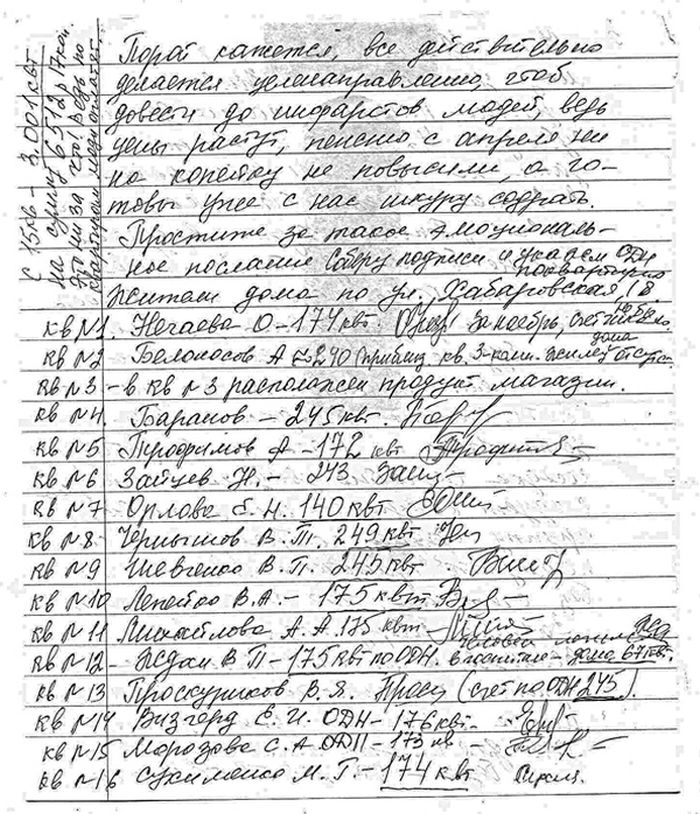 Считаем, что происходит с нами – издевательство. В нашем доме (ул. Хабаровская, 18) начисления по ОДН всегда были высокими, доходило до того, что 236 квт с одной квартиры (№13) выставляли только за лампочку в подъезде. А ведь у нас в двухэтажном доме ни подвалов, ни домофонов. Мы платили эти ОДН, но не полностью, рос долг, грозились отключениями. За октябрь опять выставили ОДН много. Мы вызвали агента Одинец. Она пришла, а счетчик в подъезде оказался вообще сломан – эти показания, выходит, были взяты «с потолка». Мы обращались и в УК «Мули», и в Ванино в «Энергосбыт», что суммы запредельные выставить без счетчика – это преступление. А сегодня мы, жители дома, получили квитанции за ноябрь. По-прежнему при отсутствии счетчика выставлены огромные счета за ОДН: кв.№1 – 174 квт, кв.№4 – 240 квт, кв. №8 – 249 квт, кв.№13 - 245квт и т.д. В итоге со всех 15 квартир дома - 30001 квт на сумму 6512 рублей 17 коп. Это ни за что, да и в подъезде лампочка всем одинаково светит! Ведь и по квартирам люди еще платят отдельно.