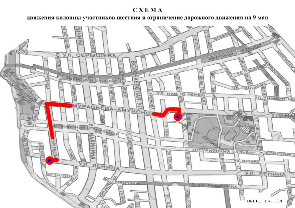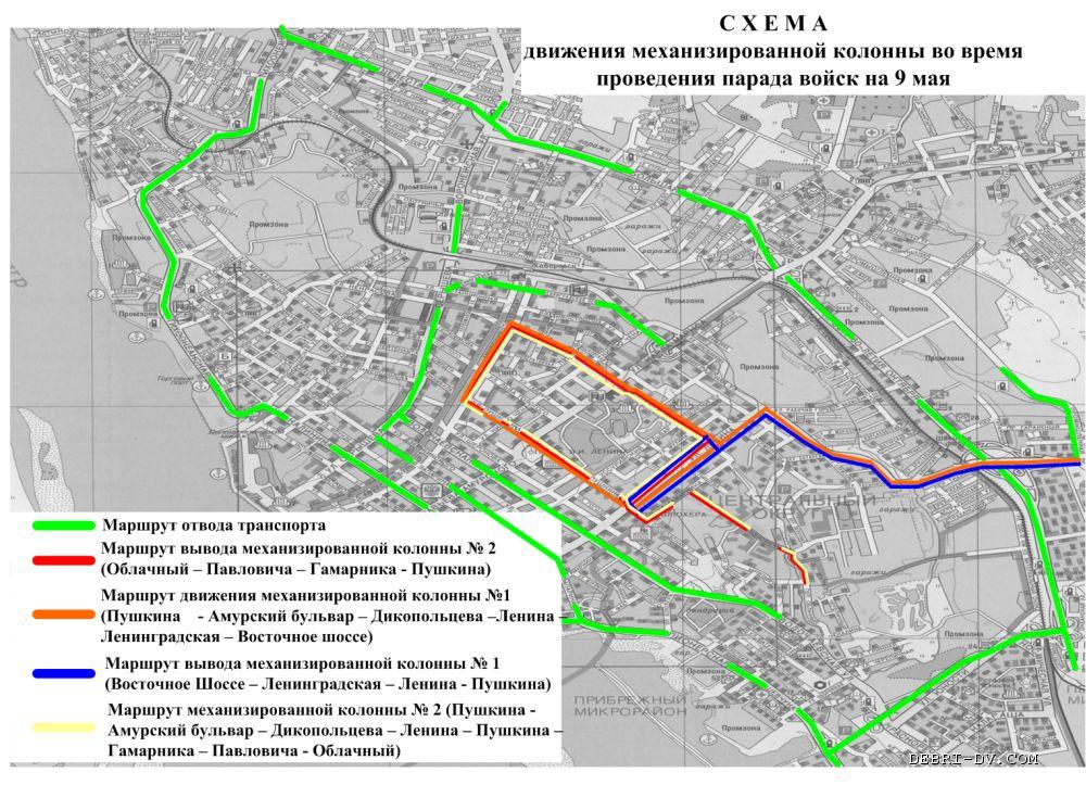 | Схема перекрытия улиц и движения механизированной колонны в Хабаровске на 9 мая. Нажмите, чтобы УВЕЛИЧИТЬ. |
