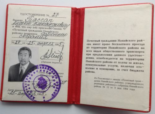 | Андрей Пассар - почетный гражданин Нанайского района. Нажмите, чтобы УВЕЛИЧИТЬ. |