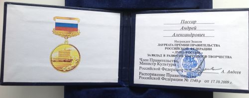 | Правительством РФ Андрею Пассару присуждена государственная премия «Душа России» в номинации «Традиционная народная культура». Нажмите, чтобы УВЕЛИЧИТЬ. |