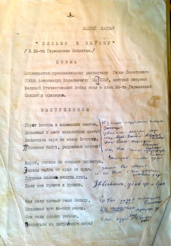 - Он неохотно рассказывал о своей семье, - говорит вдова поэта. - Был спокойным и рассудительным. Это я такая громкая и пробивная. С его слов знаю, что двоюродные братья у него - легендарные снайперы, Герои Советского Союза: старший - Максим Александрович Пассар (звание Героя России присвоено посмертно только в 2010 г., в 1943-м, при захоронении, ошибочно назван Героем Советского Союза. - Авт.) и средний - Александр Подолеевич Пассар. Он и сам был снайпером, с 1943-го служил на границе, воевал, тут, на Дальнем Востоке. Потом, до 1948-го, оставался в армии. А вот что был из рода «Красные волки», это для меня открытие...