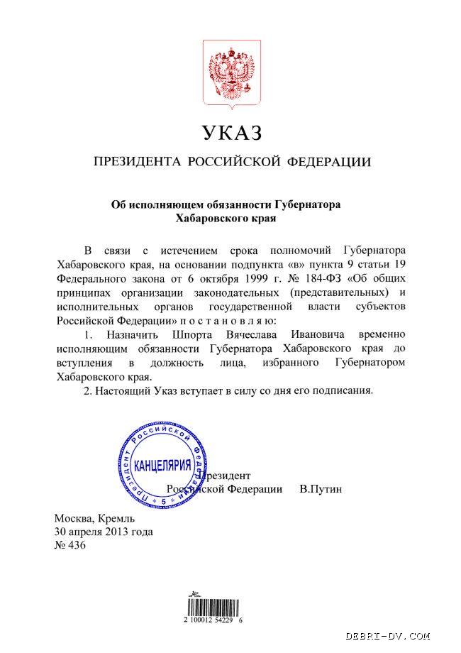 О назначении исполняющим обязанности губернатора Хабаровского края Вячеслава Шпорта (графически)