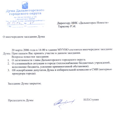 - Об оскорблении депутатов Думы и избирательной комиссии в СМИ (интервью прокурора) (см. «Трудовое слово» № 53 от 11 марта 2006 года – прим. автора).