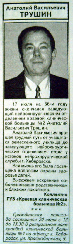 Колебания судьи можно понять. В минувшую пятницу, когда рассматривалось дело Малова и его подчиненных, в Хабаровске хоронили известного в городе нейрохирурга Анатолия Трушина. Он скончался в реанимационном отделении ККБ-2, куда его доставили из СИЗО. Как сообщили нам в нейрохирургическом отделении №2 этой больницы, которое долгие годы возглавлял Трушин, его здоровье резко ухудшилось вскоре после того, как он оказался за решеткой. По словам врачей, в СИЗО у Трушина случился инсульт.