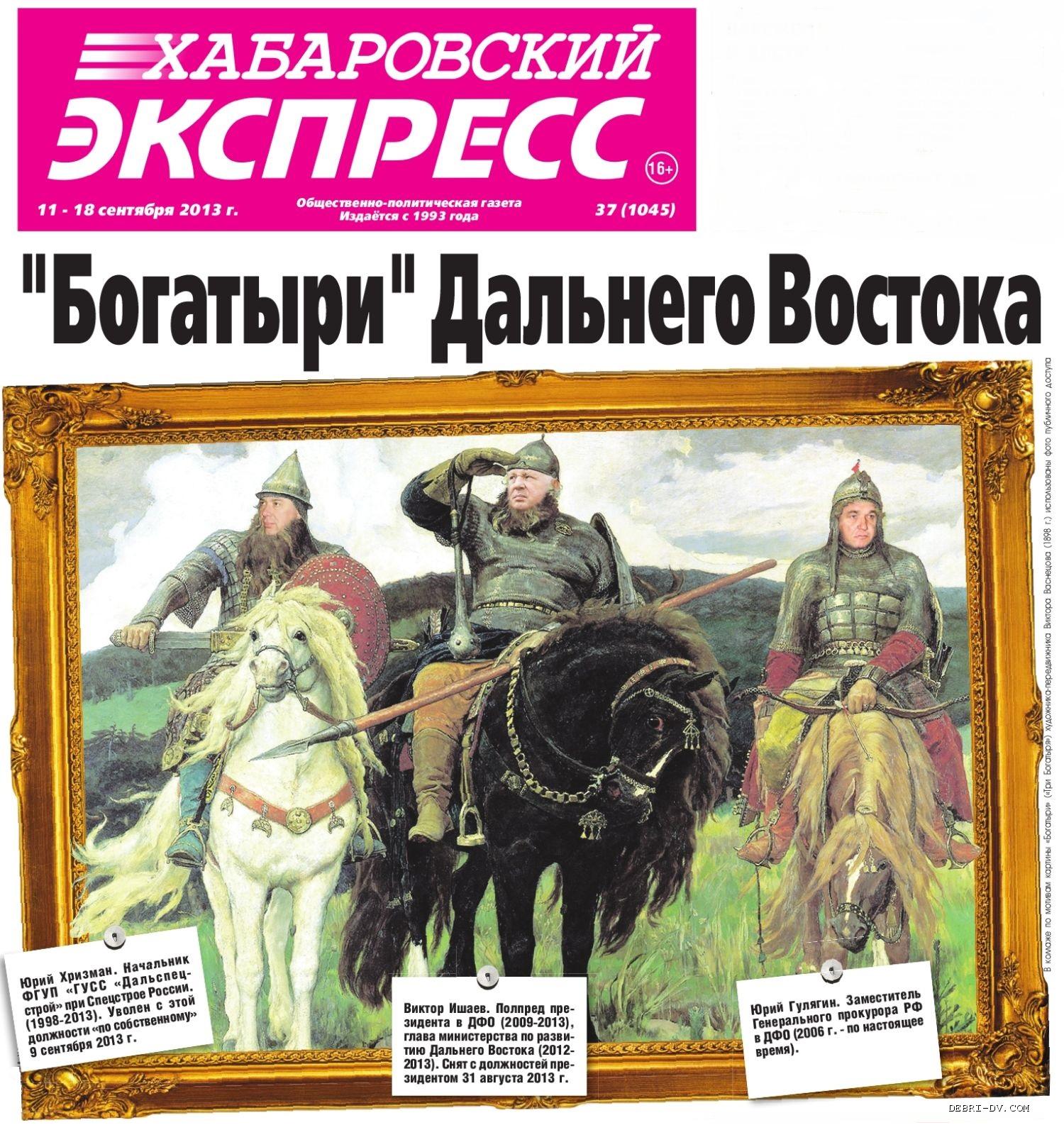 | Первая полоса газеты «Хабаровский Экспресс», №37, 11.09.13. Юрий Хризман (слева) и Виктор Ишаев (в центре)./ Нажмите, чтобы УВЕЛИЧИТЬ |