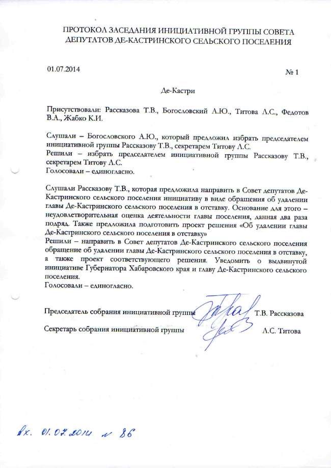 По ее словам проект решения совета депутатов Де-Кастринского сельского поселения Ульчского района Хабаровского края уже готов. Называется он «Об удалении главы Де-Кастринского сельского поселения в отставку».